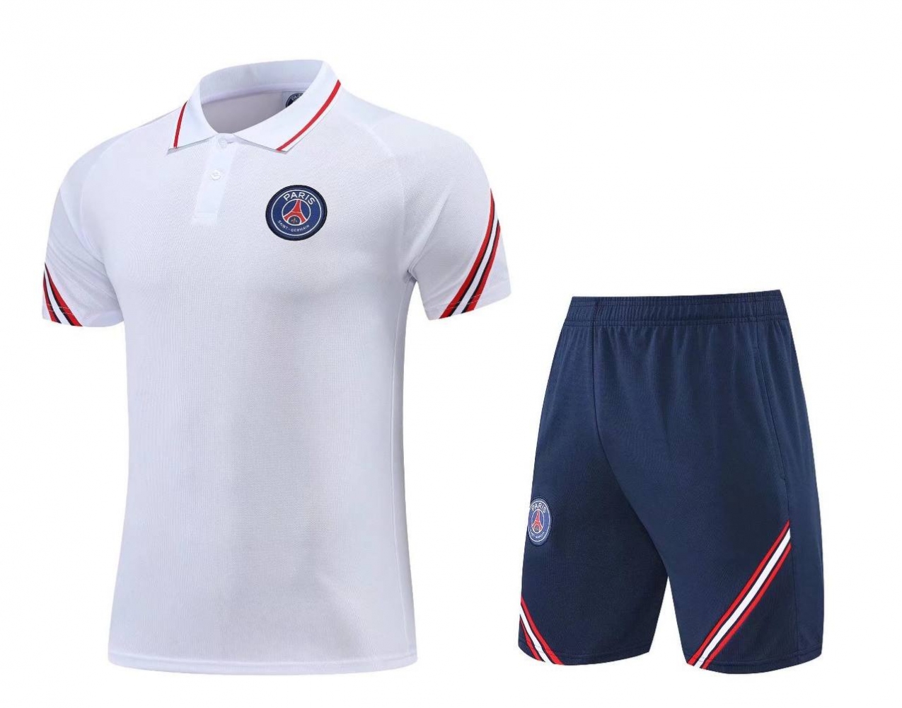 Комплект «ПСЖ» виконана в білому кольорі із червоними смужками на руквах. Окантовка коміра червона. Емблема ПСЖ вишита. Шорти темно-синього кольору. Наявність кишень на шортах.